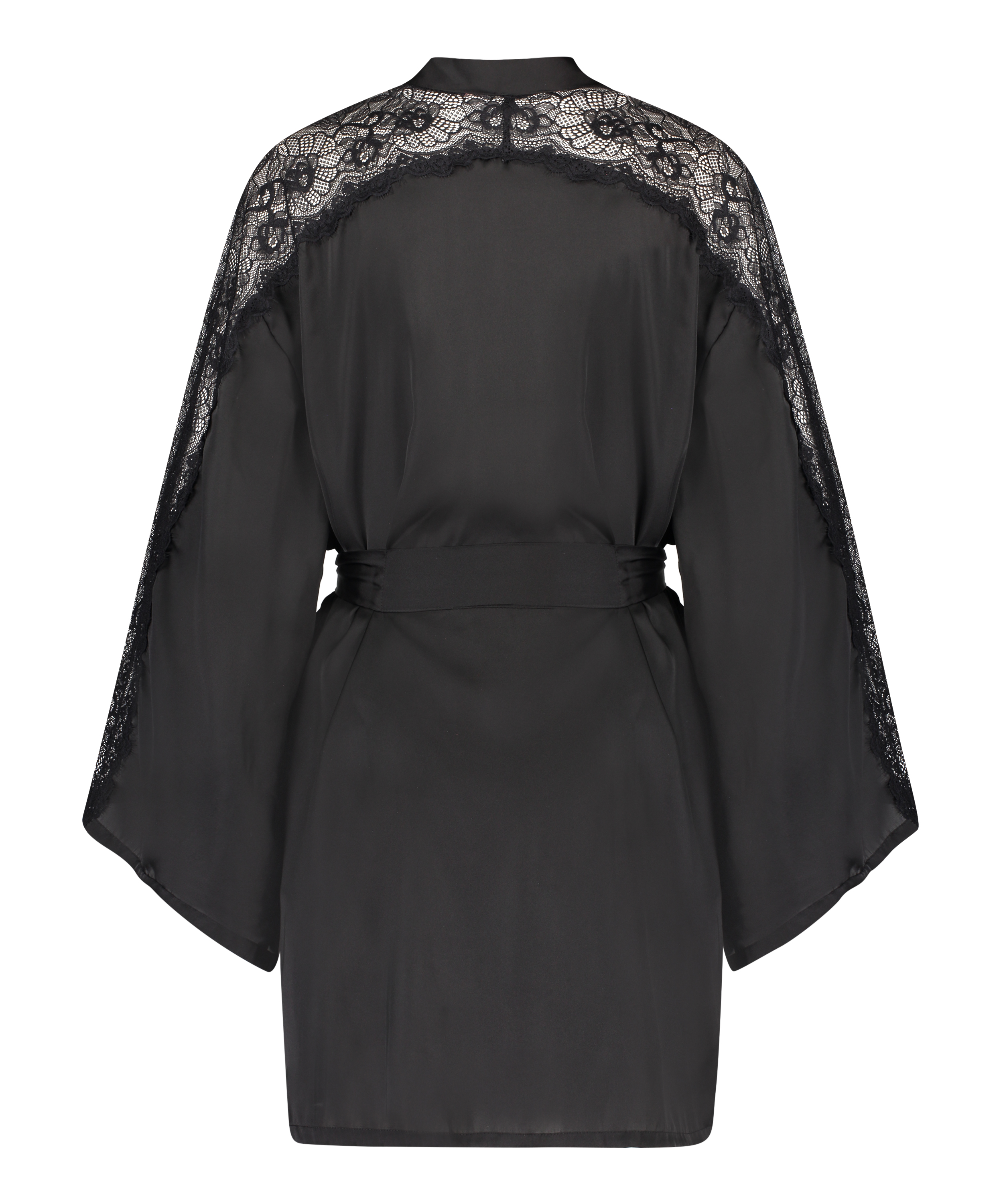 To przepiękne kimono to obowiązkowy strój w Twojej szafie! Posiada koronkowe detale na rękawach i na plecach. Ma dekolt w kształcie litery V. Idealny do noszenia na bieliznę!