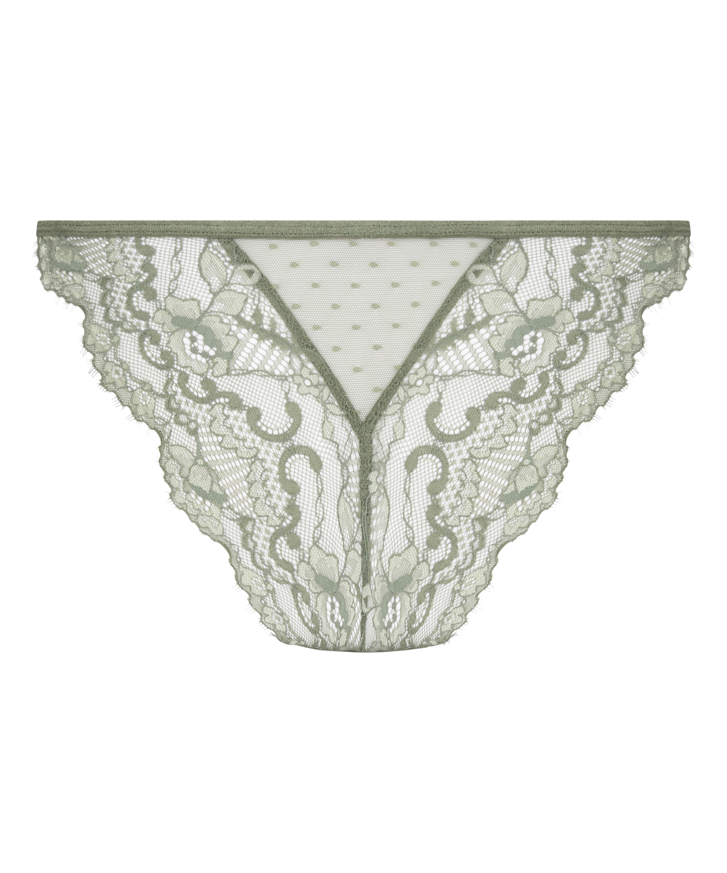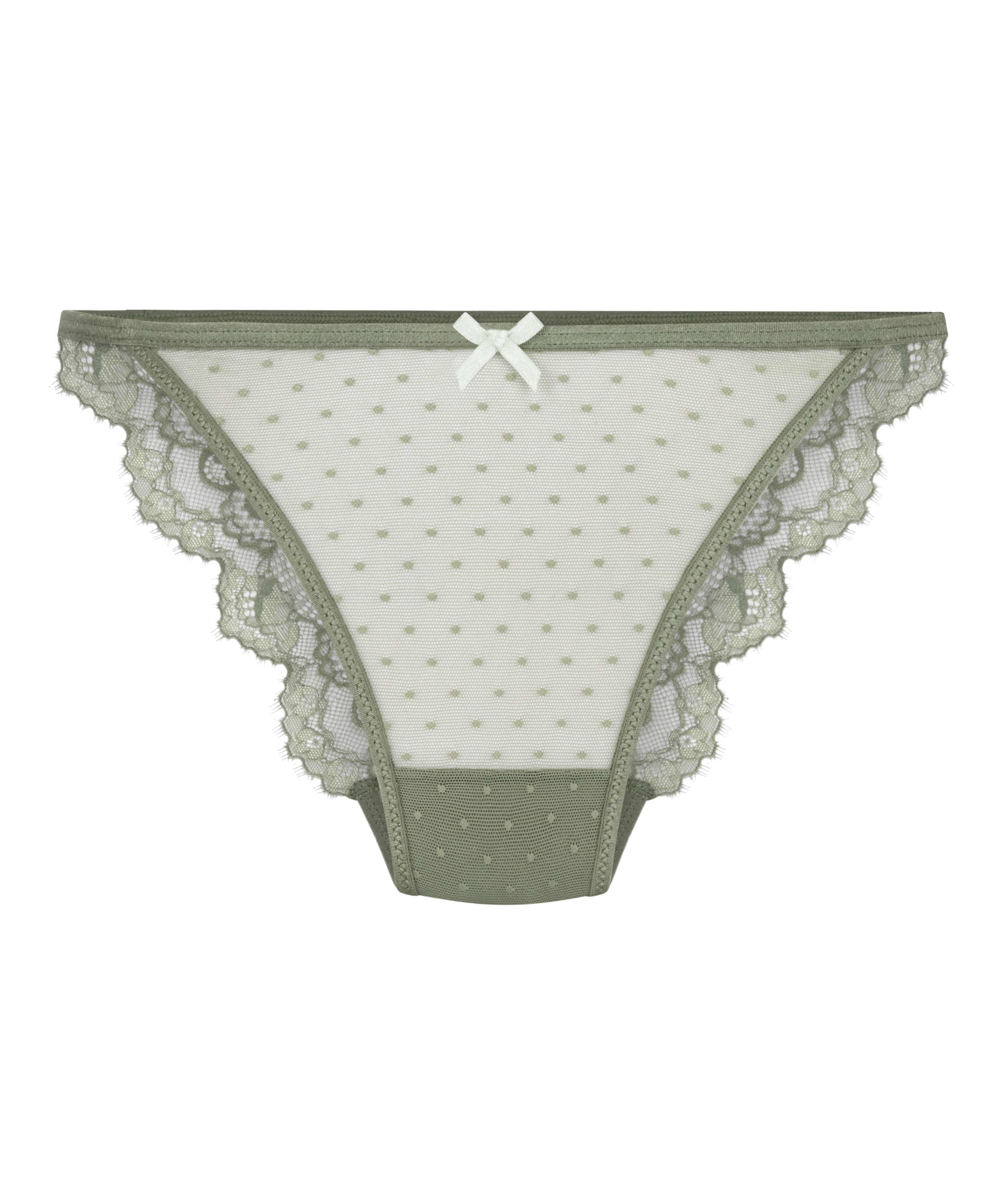 Podkreśl swój styl z tymi kobiecymi brazyliany, zaprojektowanymi z kokieteryjnym przodem z siateczki w grochy oraz całkowicie koronkowym tyłem dla eleganckiego, romantycznego akcentu. Delikatna kokardka pośrodku dodaje słodkiego, kobiecego charakteru – idealne na szykowny i zalotny plażowy look. Połącz z pasującym biustonoszem, aby stworzyć w pełni skoordynowany komplet!