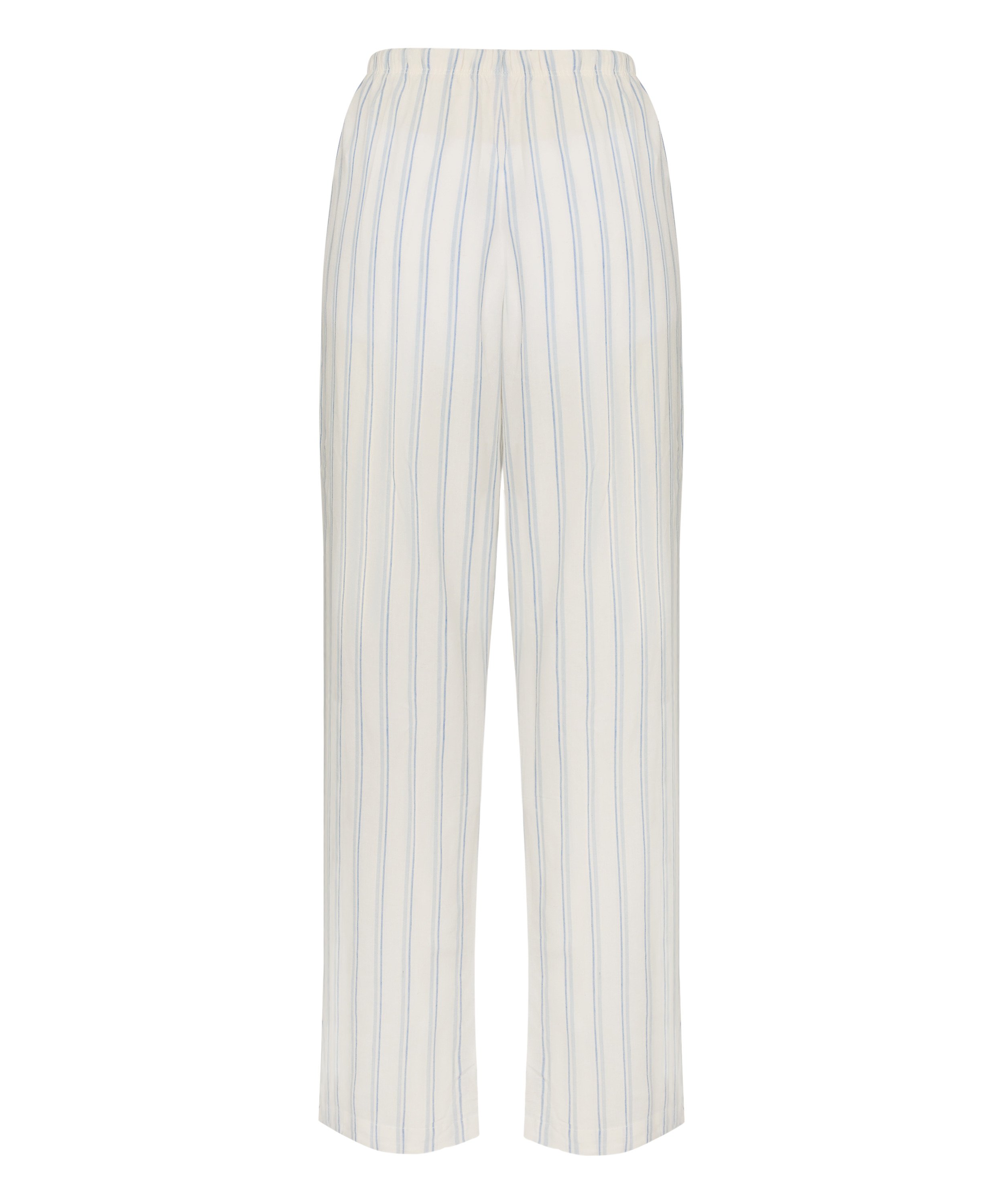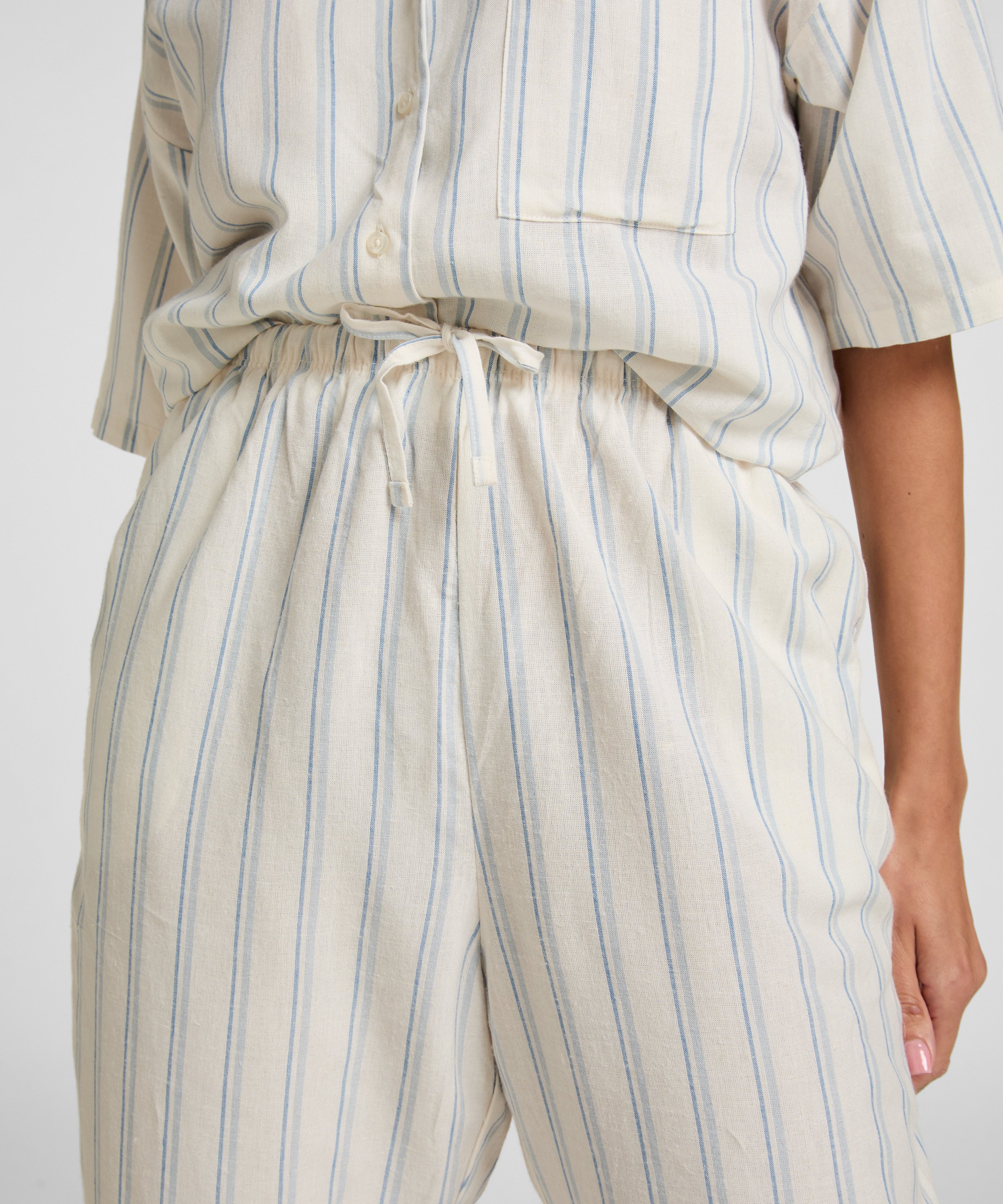 Luźne lniane spodnie z przewiewnej tkaniny o miękkiej strukturze. Elastyczny pas ze sznurkiem umożliwia regulowane dopasowanie. Szerokie nogawki i pionowe paski tworzą swobodną sylwetkę. Idealne do zestawienia z pasującym szlafrokiem lub jako lekka odzież domowa na ciepłe dni.
