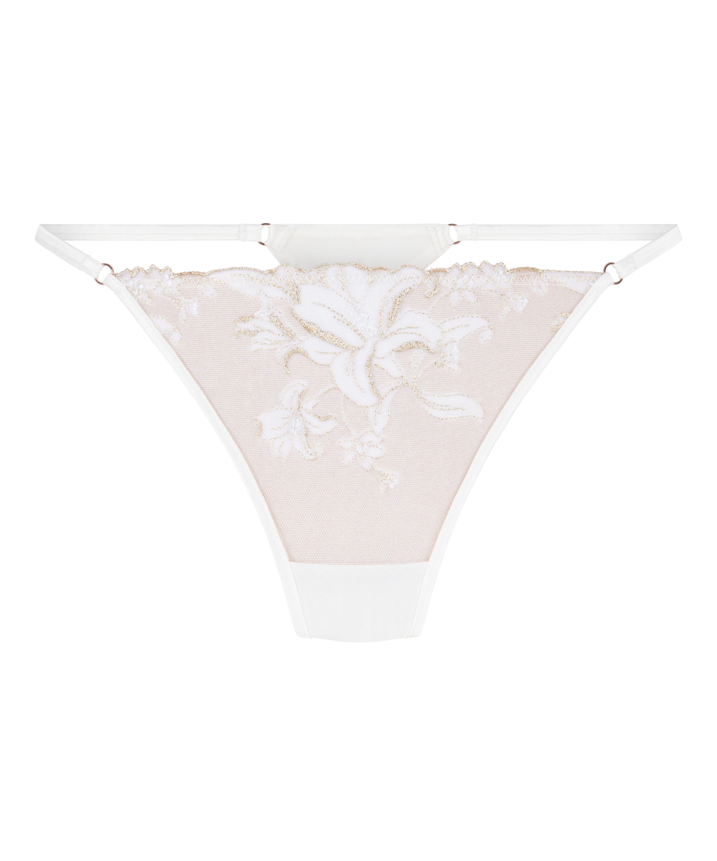 Podkręć swoją zmysłowość dzięki tym stringom z wysokim stanem, ozdobionym delikatną koronką w kwiatowy wzór i przezroczystą siateczką dla ultra-transparentnego, uwodzicielskiego wyglądu. Tył wykonany jest z gładkiego satyny dla luksusowego wykończenia, tworząc idealną równowagę między elegancją a komfortem. Zaprojektowane, aby optycznie wydłużyć nogi i podkreślić sylwetkę, te stringi to odważny, ale kobiecy element Twojej kolekcji bielizny. Połącz je z pasującym biustonoszem dla kompletnego looku!