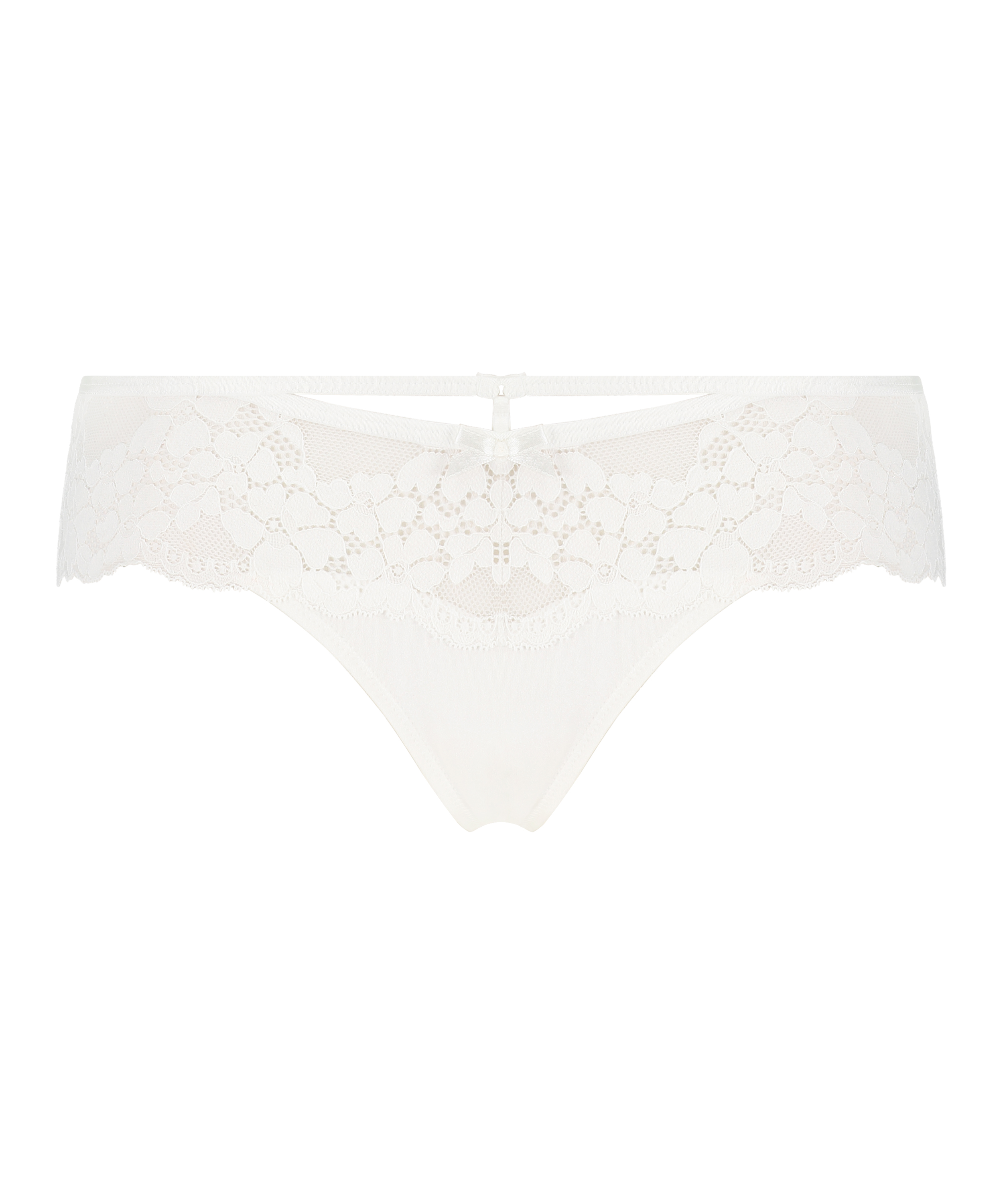 Te seksowne stringi są wykończone na górze koronką i mają ozdobne paseczki. Mała kokardka stanowi stylowe wykończenie.