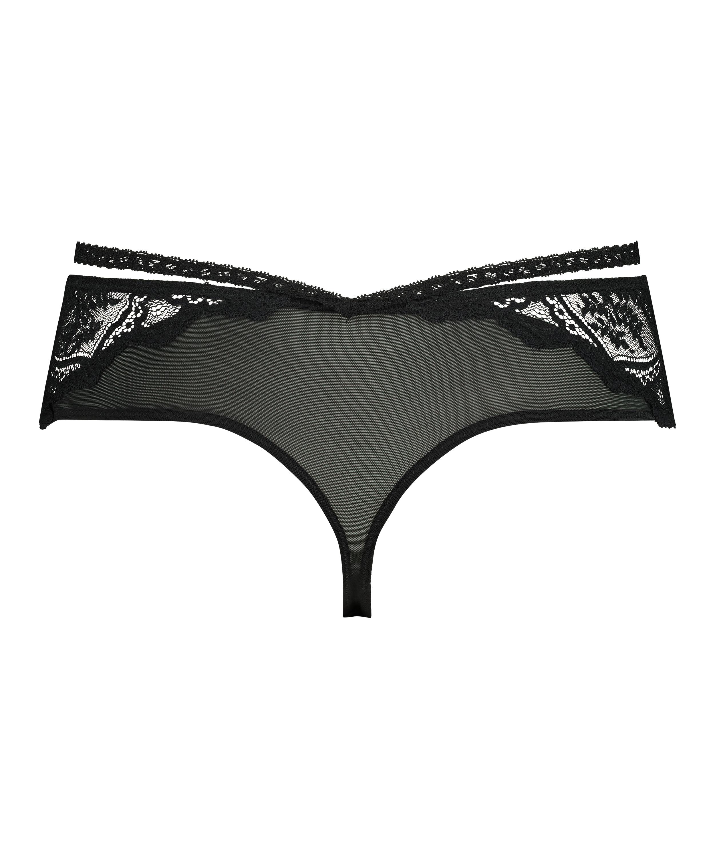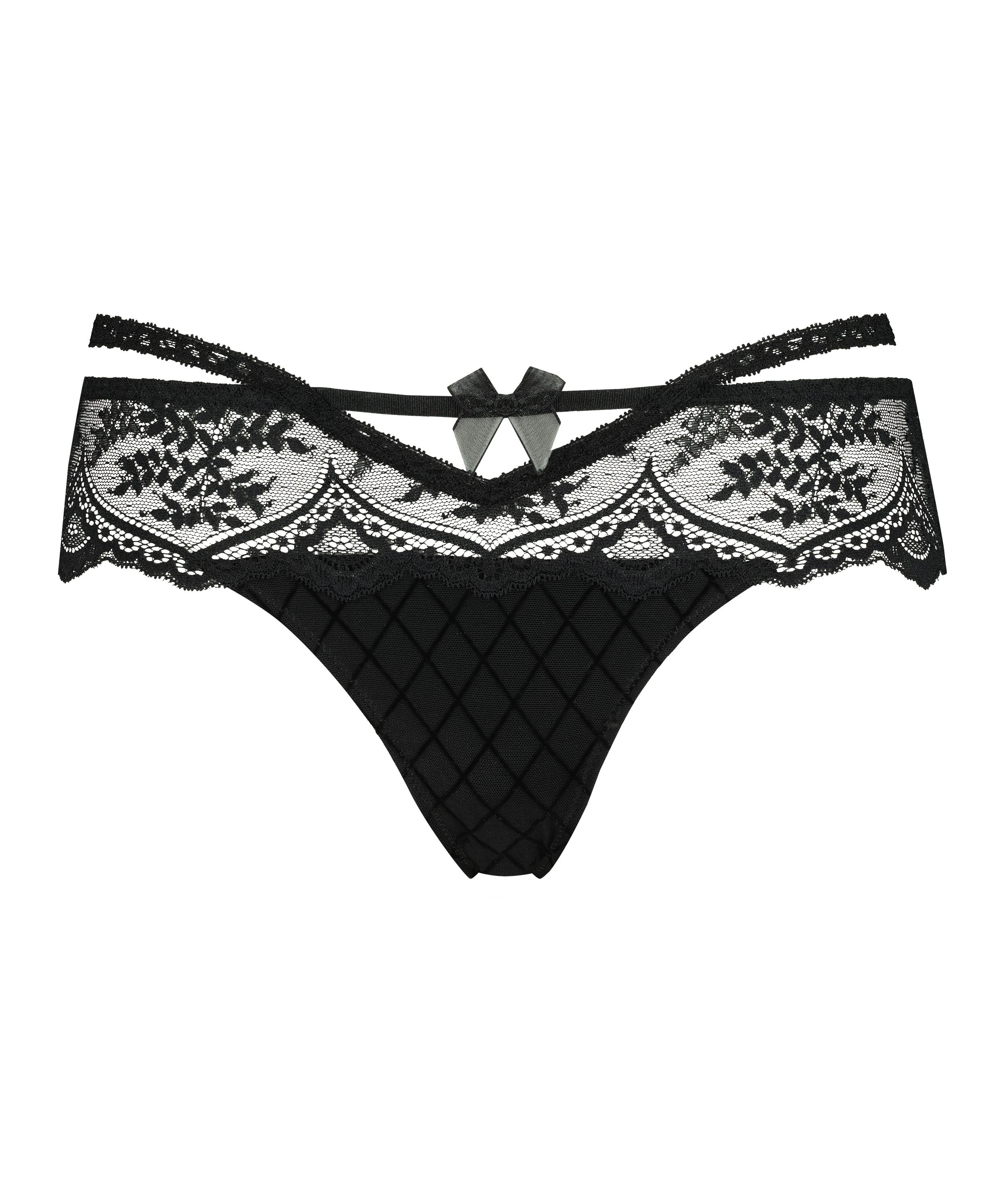 Te wspaniałe stringi są niemal w całości wykonane z koronki. Mają z przodu kokardkę, lekko prześwitują i mają ozdobne paseczki. Połącz z dopasowanym biustonoszem lub braletką, aby stworzyć komplet.