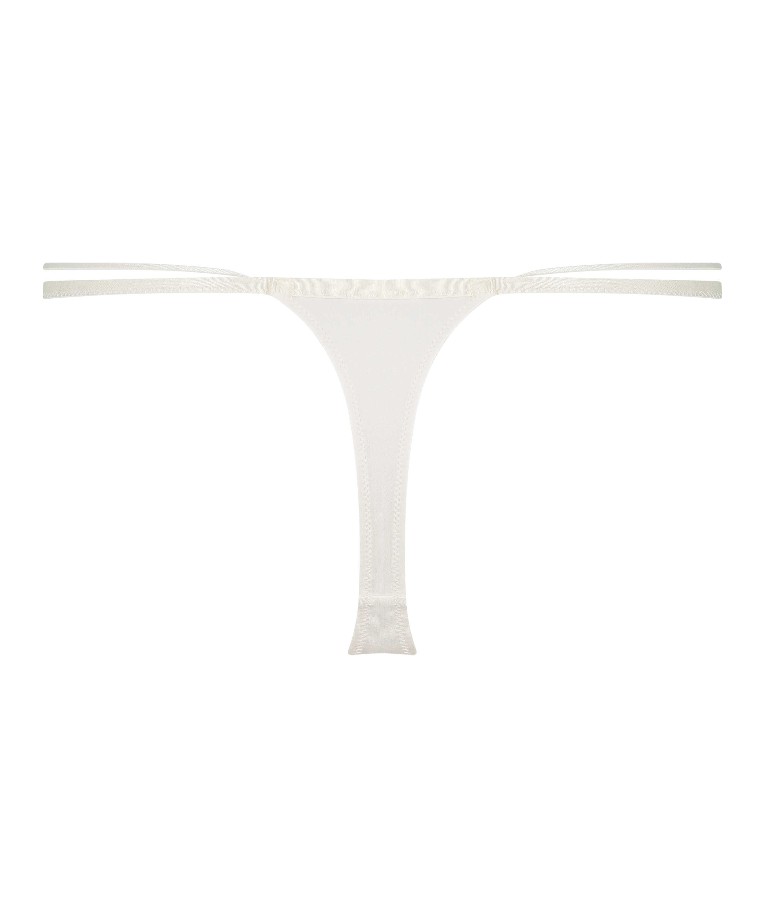 Modne stringi z przezroczystą koronką z przodu i siateczką z tyłu. Mała kokardka pośrodku stanowi stylowe wykończenie. Z przodu i na górze bioder znajdują się zabawne paski. Połącz z biustonoszem z kompletu!