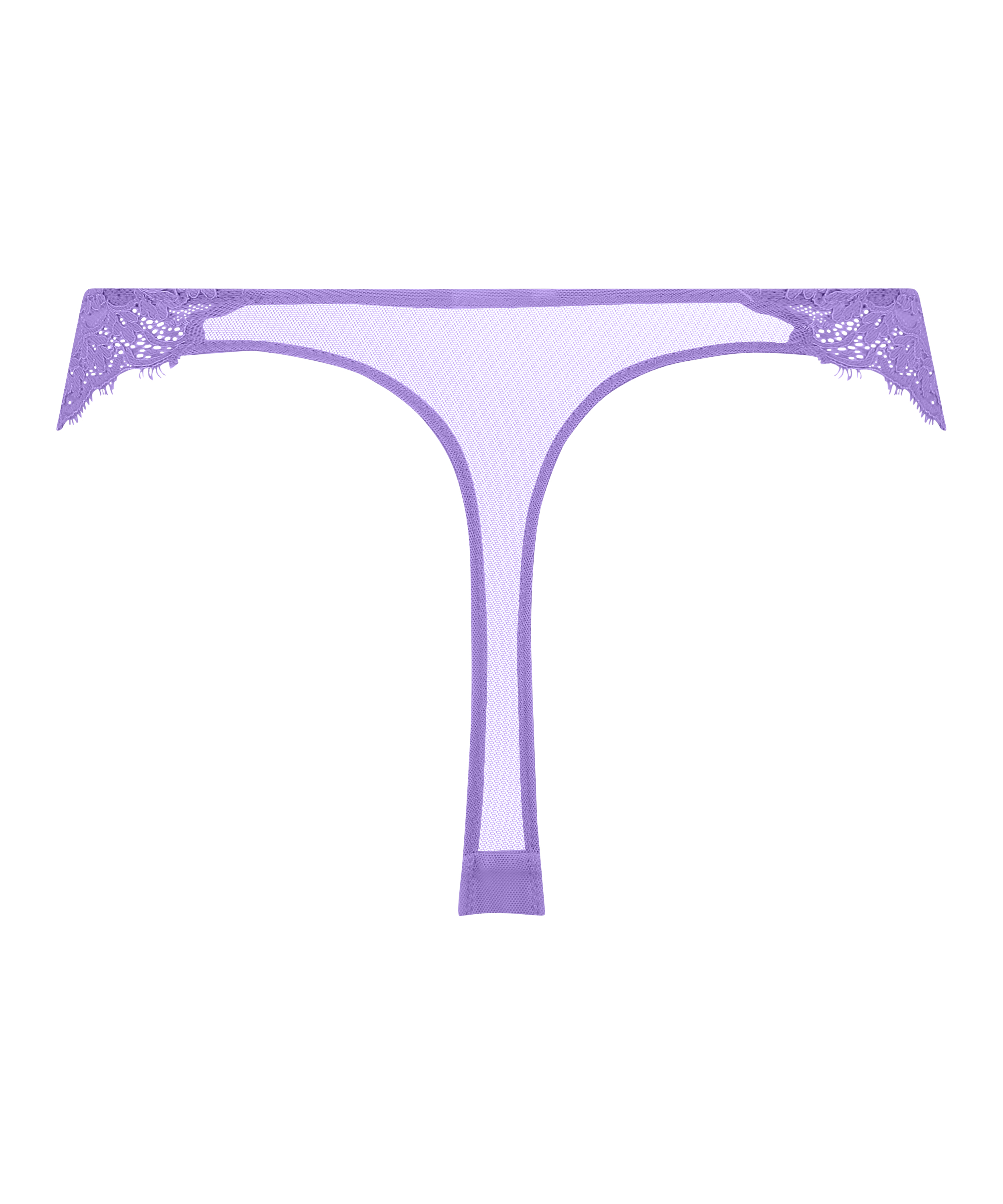 Te modne stringi mają przezroczysty koronkowy przód i siateczkowy tył. Mały guzik na środku przodu stanowi uzupełnienie całości.