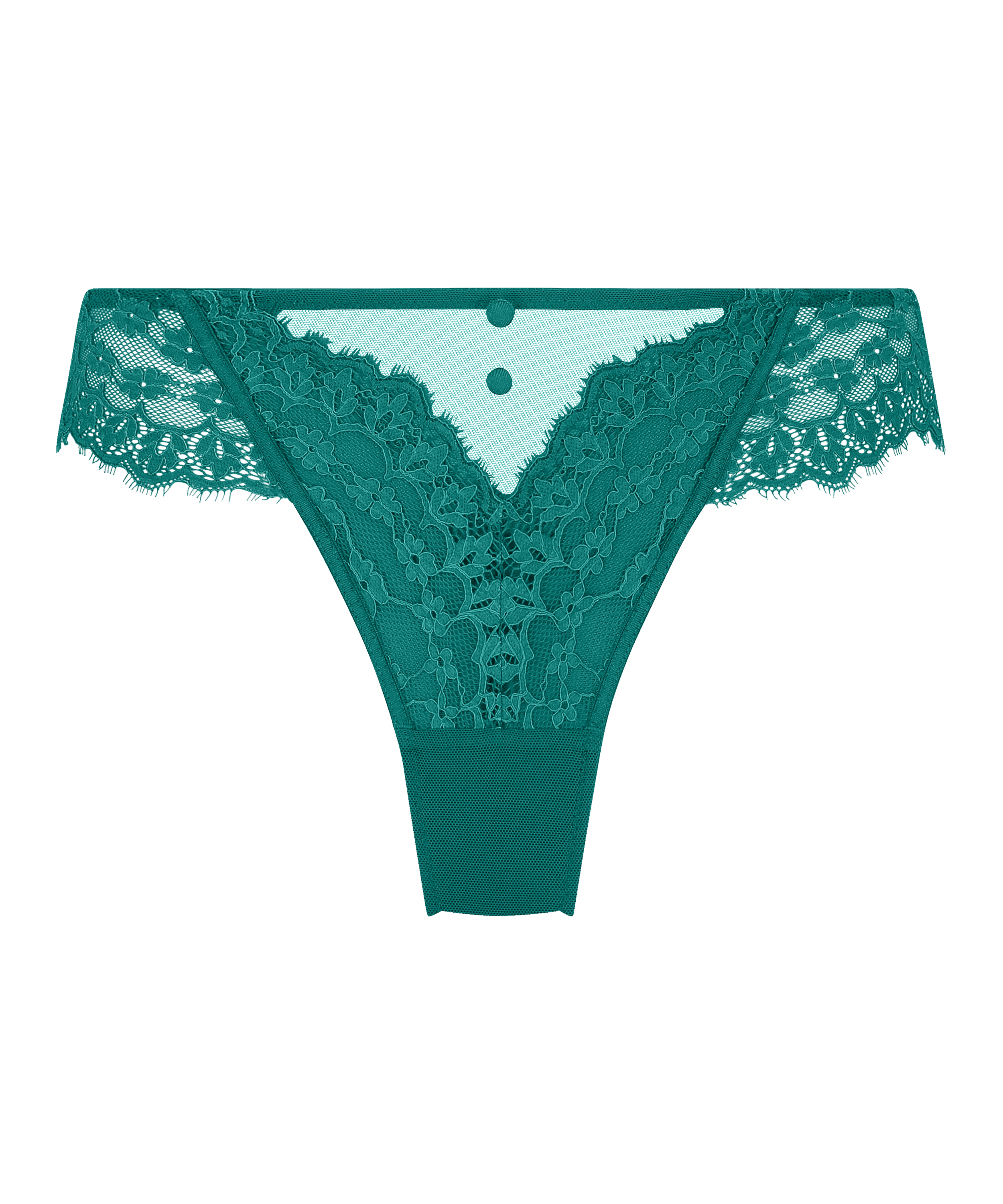 Te modne stringi mają przezroczysty koronkowy przód i siateczkowy tył. Mały guzik na środku przodu stanowi uzupełnienie całości.