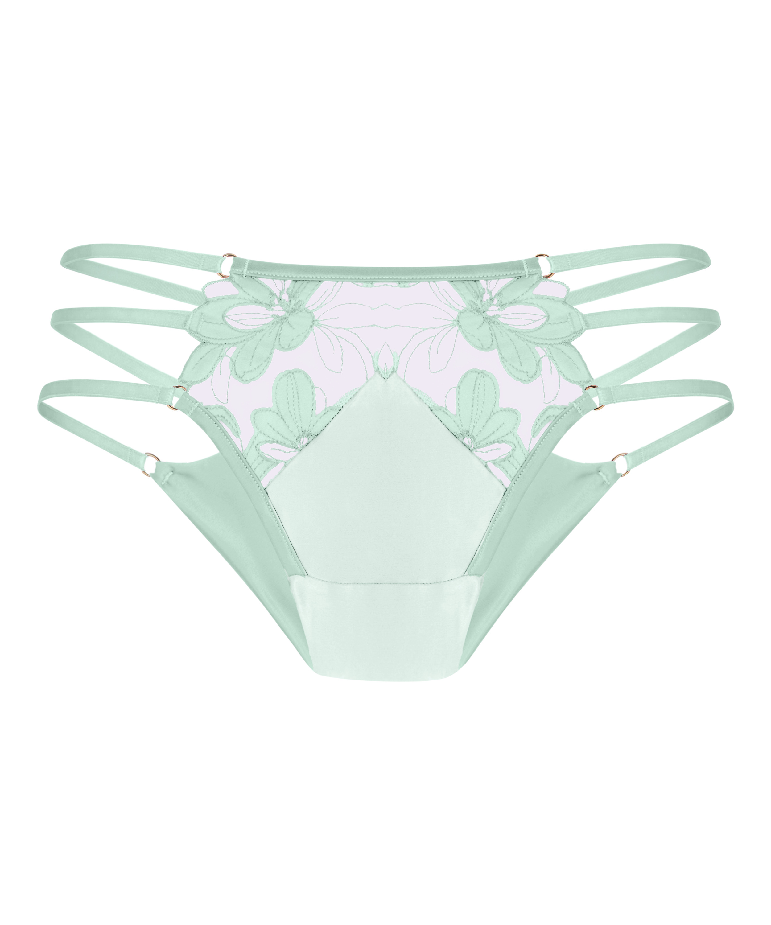 Miękkie stringi z siateczki w jasnym odcieniu aqua z delikatnym kwiatowym haftem z przodu. Półprzezroczysta tkanina zapewnia lekkie i niemal niewyczuwalne dopasowanie. Wysokie wycięcie podkreśla naturalny kształt bioder. Komfortowy model idealny do zestawienia z pasującym biustonoszem.