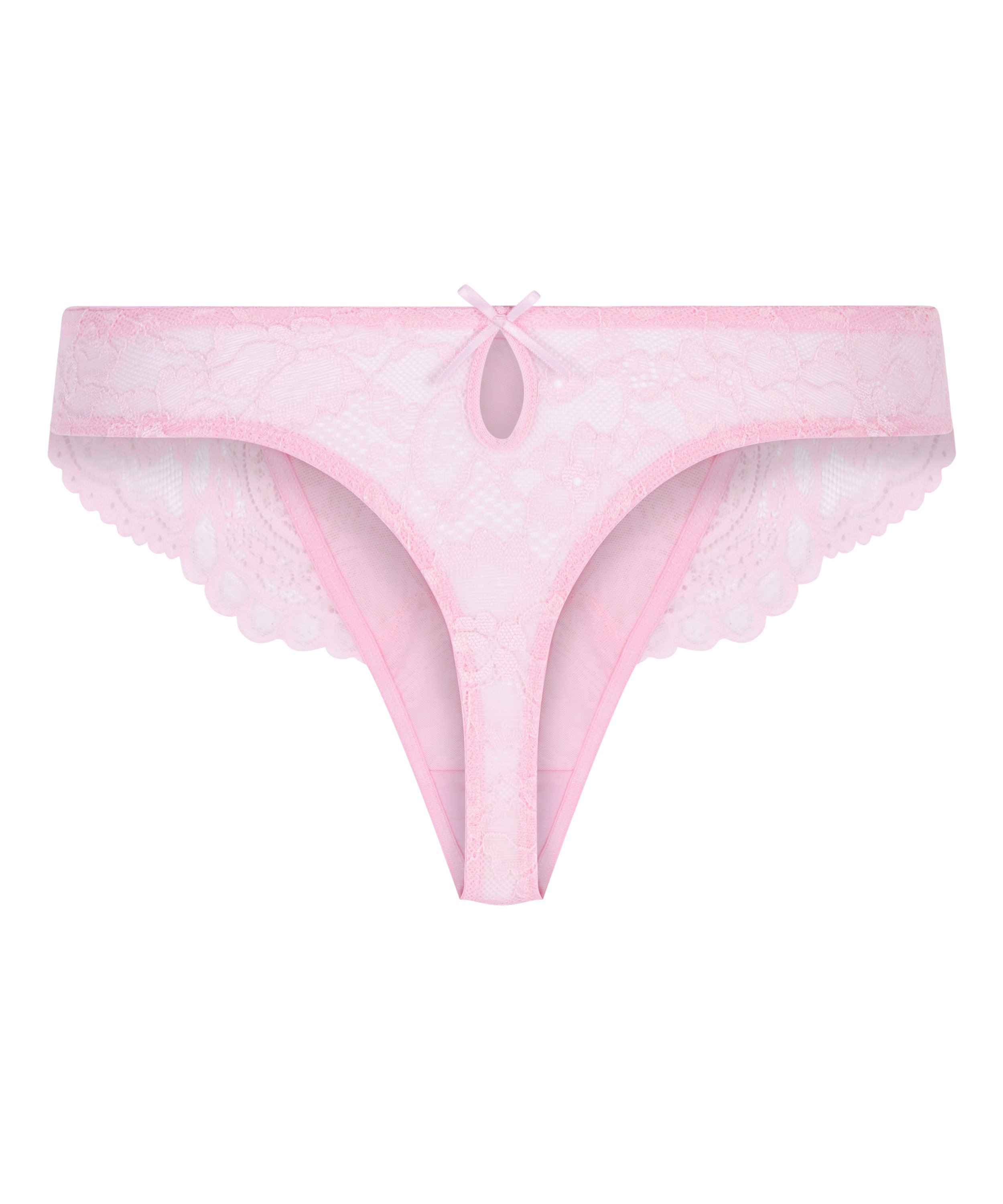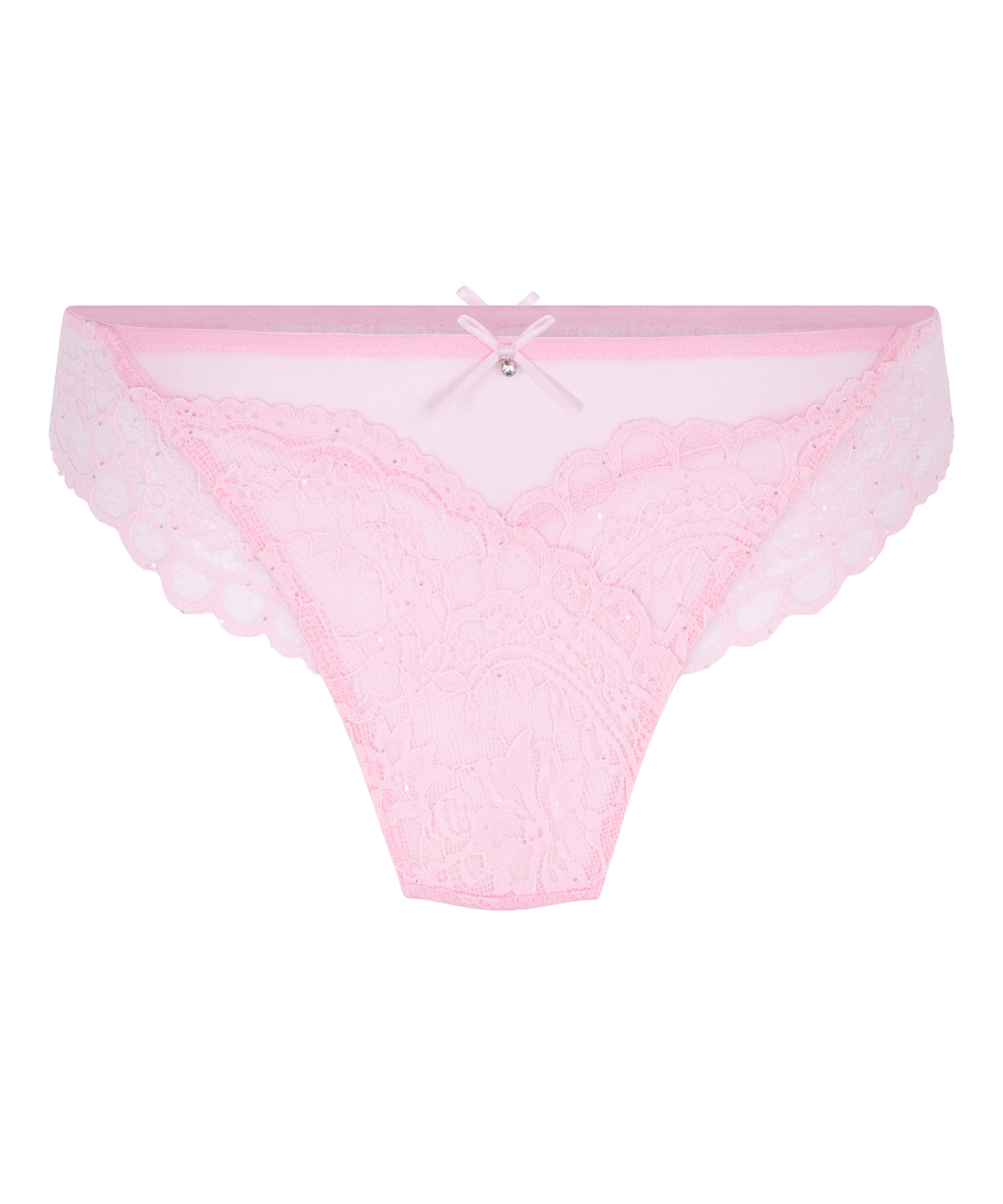 Odrobina koronki nigdy nie zaszkodzi! Te stringi są wykonane z półprzejrzystej różowej koronki. Dodaj dopasowany biustonosz, aby dopełnić look.