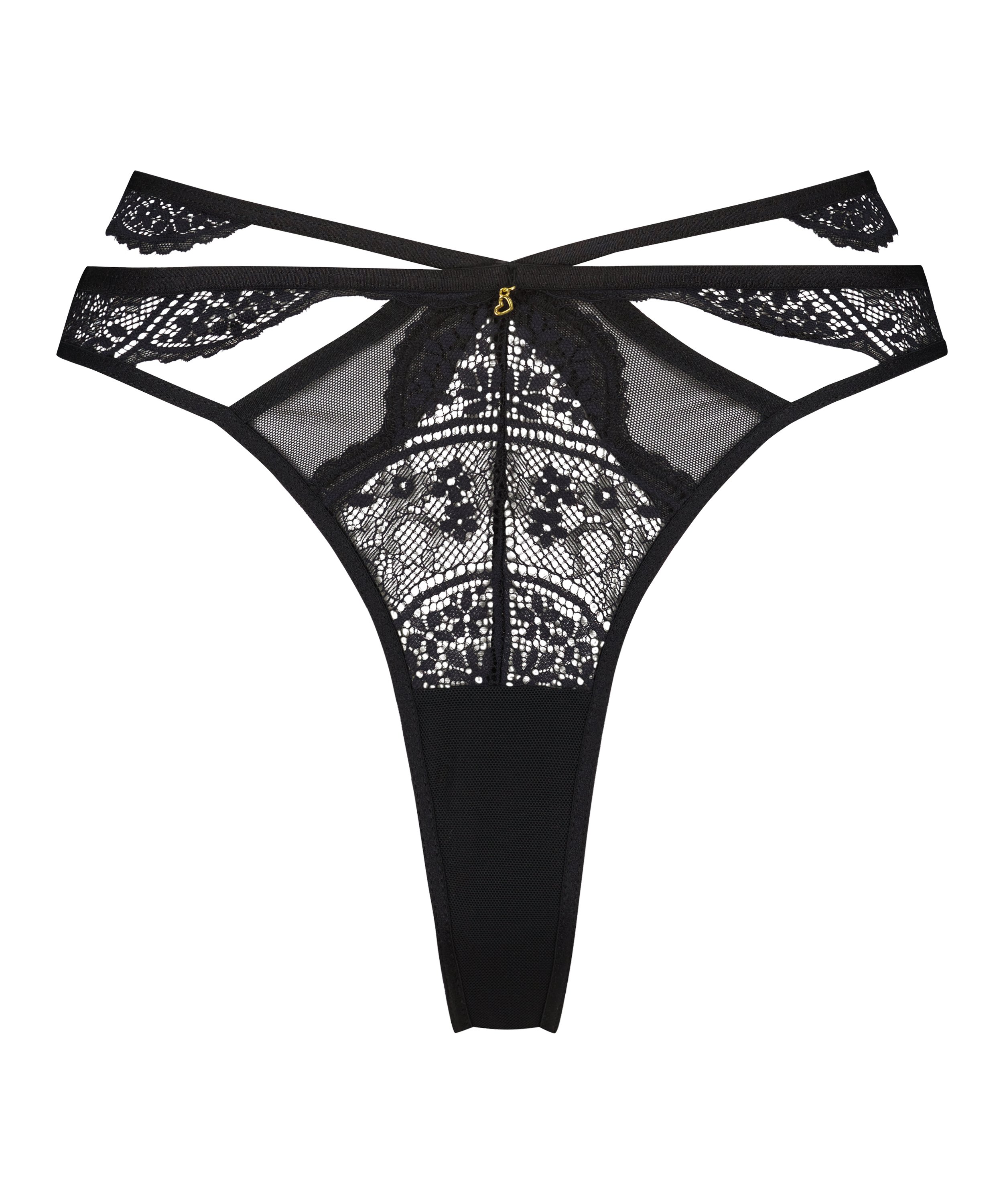 Poczuj się bardzo seksownie w tych stringach! Mają paseczki i słodką zawieszkę w kształcie serca z przodu. Romantyczna koronka tworzy półtransparentny wygląd. Połącz z ulubionym stanikiem, aby uzyskać kompletną stylizację.