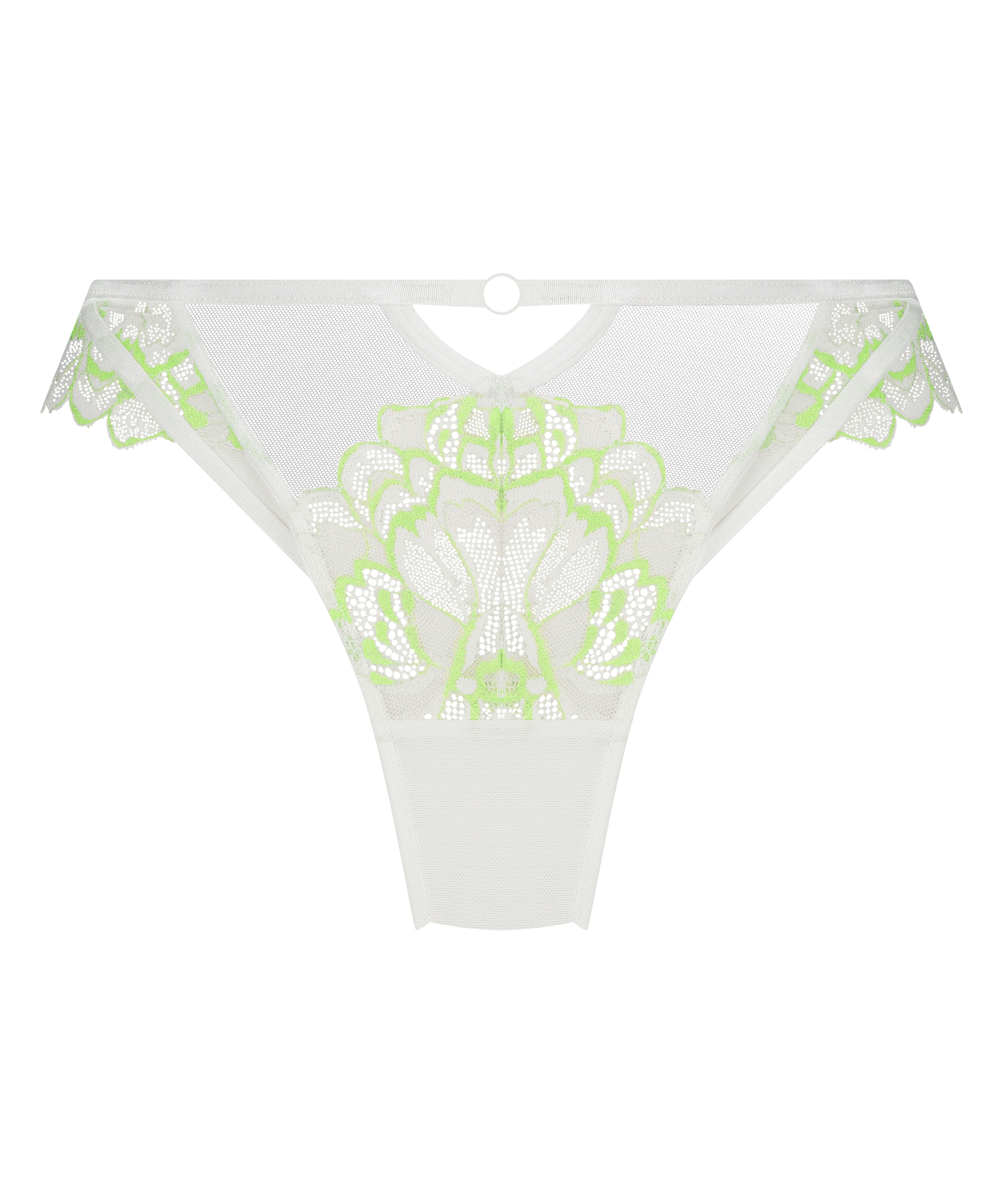 Zwiększ swoją pewność siebie w naszych seksownych stringach koronkowych! Wykonana z delikatnego haftu i siateczkowej tkaniny. Połącz ją ze swoim ulubionym biustonoszem i stwórz oszałamiający komplet bielizny.
