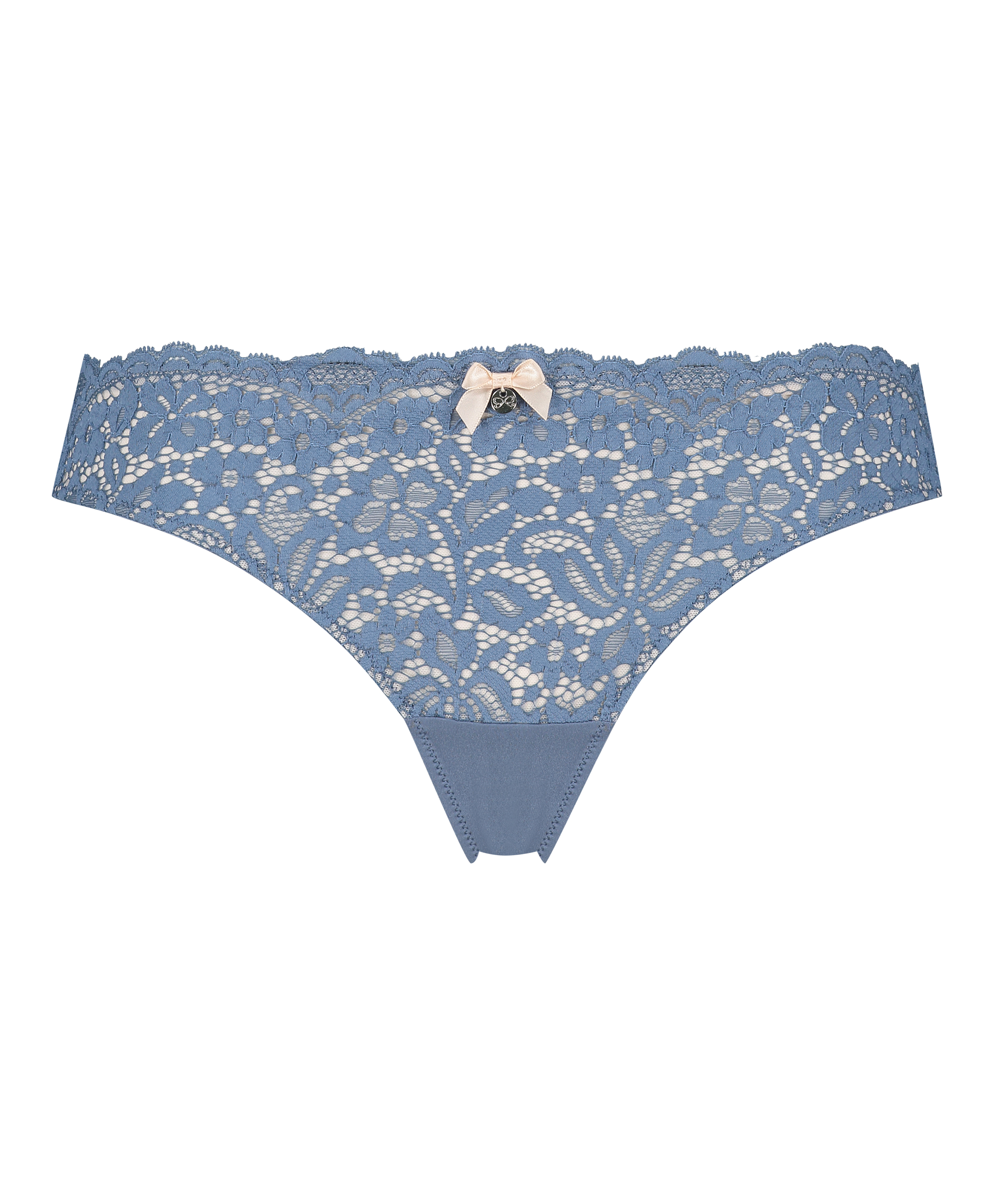 Poczuj się seksownie w tych stringach! Stringi wykończone są koronką i kokardką z przodu. Połącz z pasującym biustonoszem, aby uzyskać kompletny strój! Koronka wykonana jest w 68,1% z nylonu pochodzącego z recyklingu.