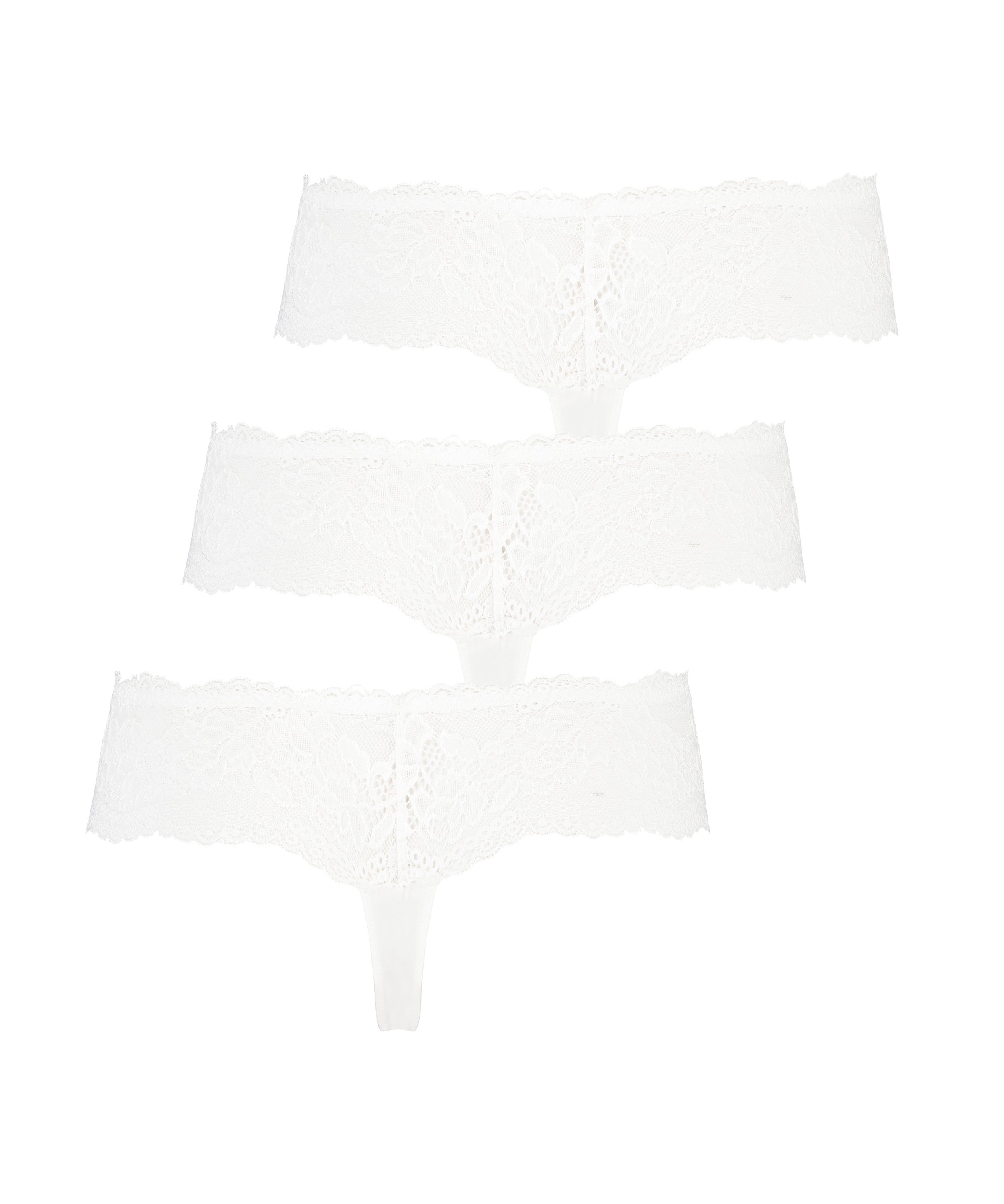 Wybierz te urocze stringi typu bokserki w poręcznym 3-paku! Mają dużo koronki i uroczą kokardkę z przodu. Połącz z ulubionym biustonoszem w tym samym kolorze.