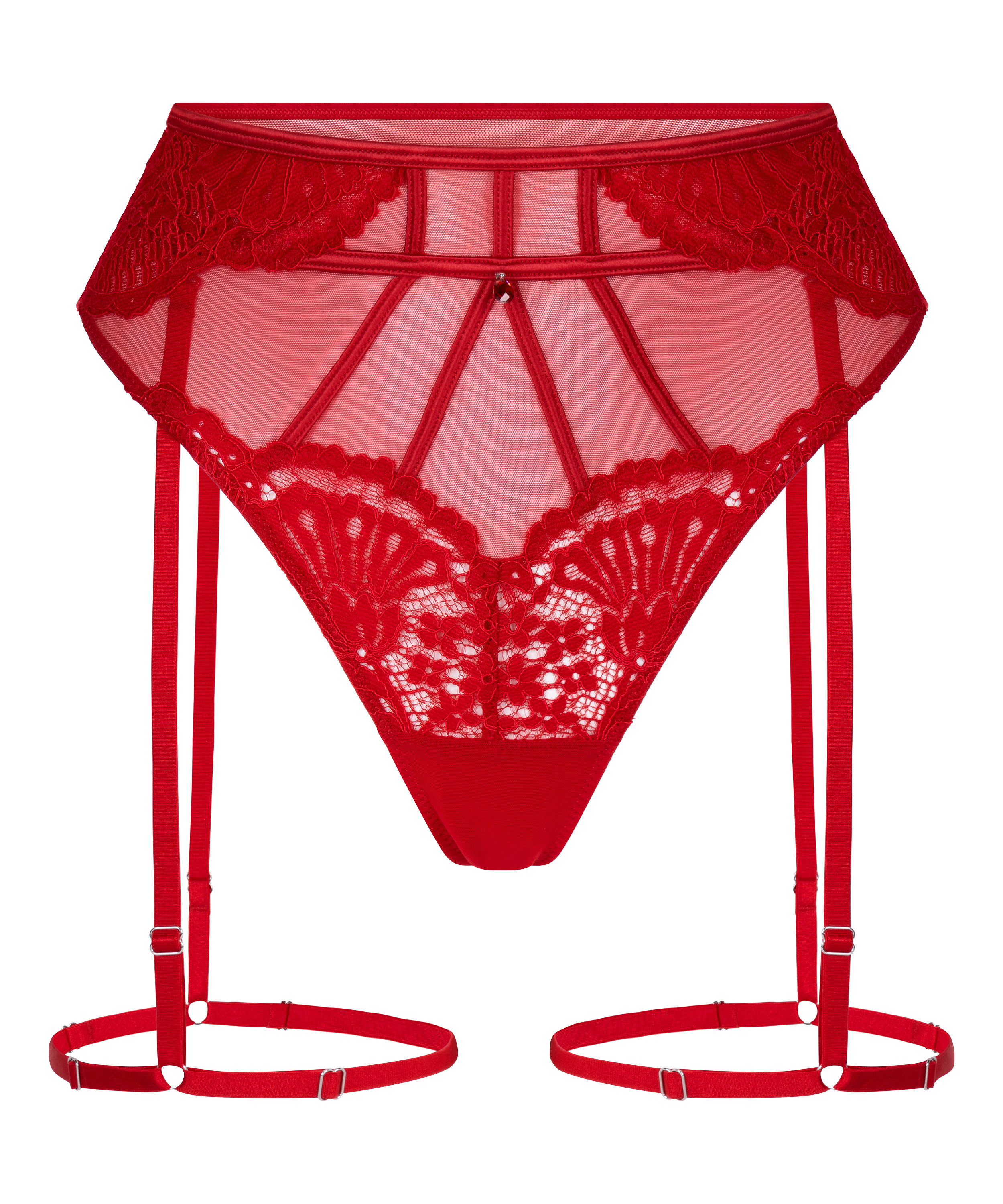 Zaprojektowane, by olśniewać, te wyraziste stringi łączą w sobie delikatną fakturę z dbałością o szczegóły. Wykonane z koronki i paneli z siateczki, oferują uwodzicielską sylwetkę i poczucie luksusu. Błyszczący klejnot w środku dodaje odrobinę blasku, a odpinane paski do pończoch na swój sposób dają stylizacji swobodę. Połącz z dopasowanym biustonoszem, aby uzyskać komplet.