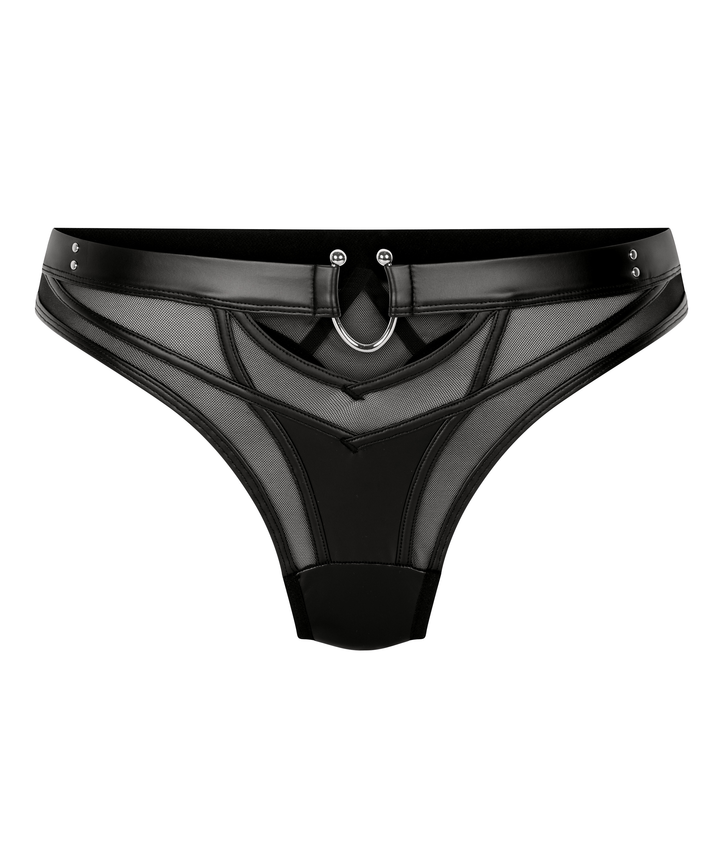 Podkręć temperaturę dzięki naszym stringom – odważnemu połączeniu faktury, przejrzystości i charakteru. Ten przyciągający wzrok element garderoby łączy sztuczną skórę z panelami z siateczki, co tworzy odważny i wyrafinowany kontrast. Srebrne ćwieki dodają odrobinę metalowego blasku, nadając stringom buntowniczy charakter, który idealnie sprawdzi się w wyrazistych stylizacjach. Połącz z dopasowanym biustonoszem, aby uzyskać komplet.
