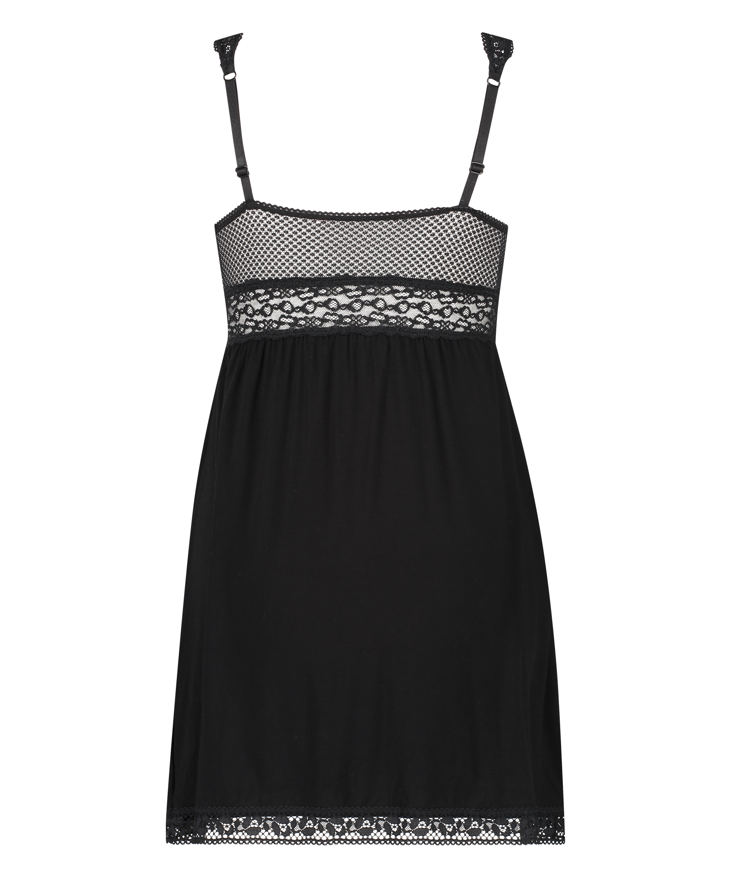 Ta sukienka na ramiączkach to świetny dodatek do Twojej garderoby! Z głębokim dekoltem w kształcie litery V i koronkowymi detalami. Pięknie komponuje się z seksowną bielizną!