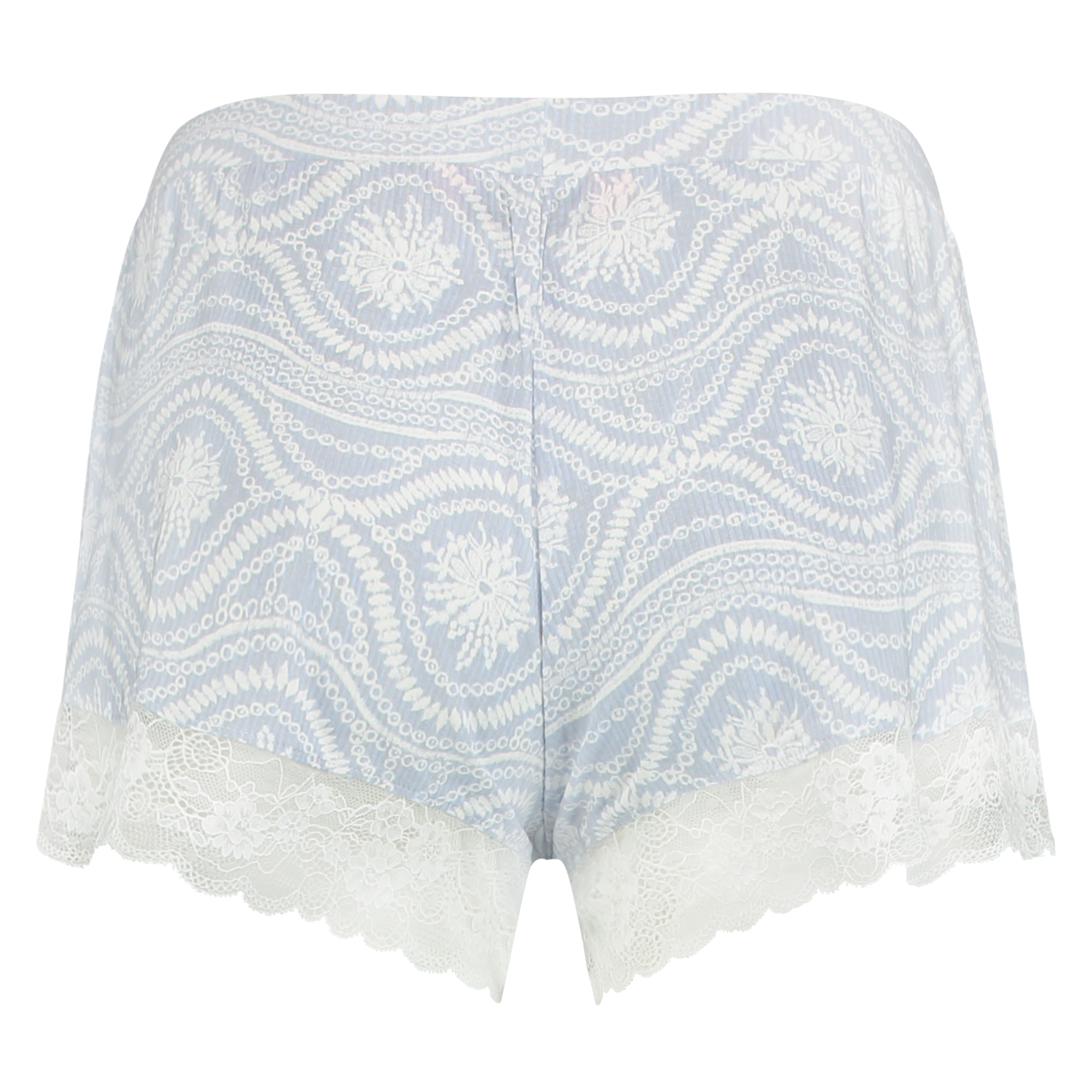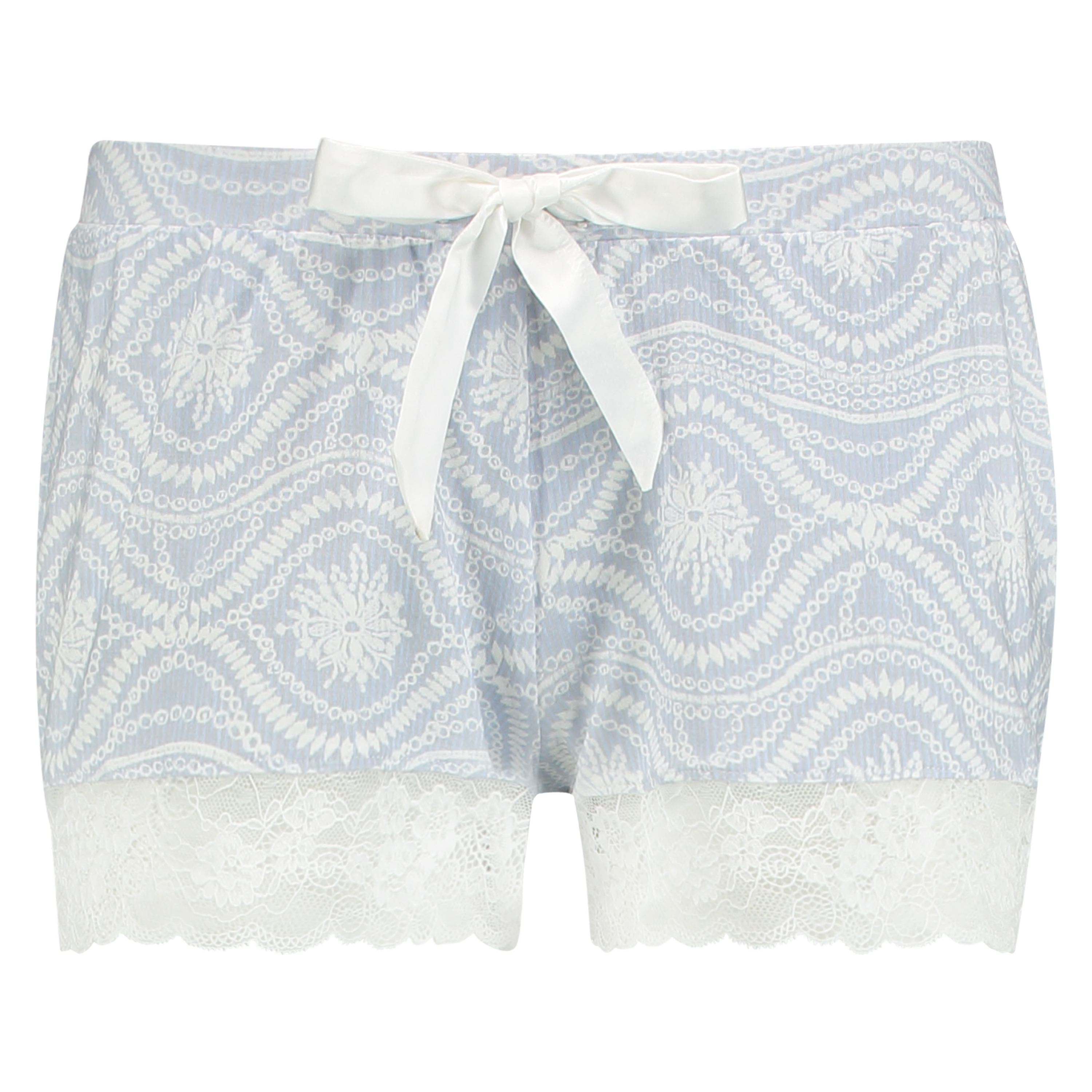 Wskocz do łóżka w tych uroczych szortach piżamowych, wykonanych z miękkiego i przyjemnego w dotyku materiału! Wykończone koronkową lamówką wokół nogawek i satynową kokardką z przodu.