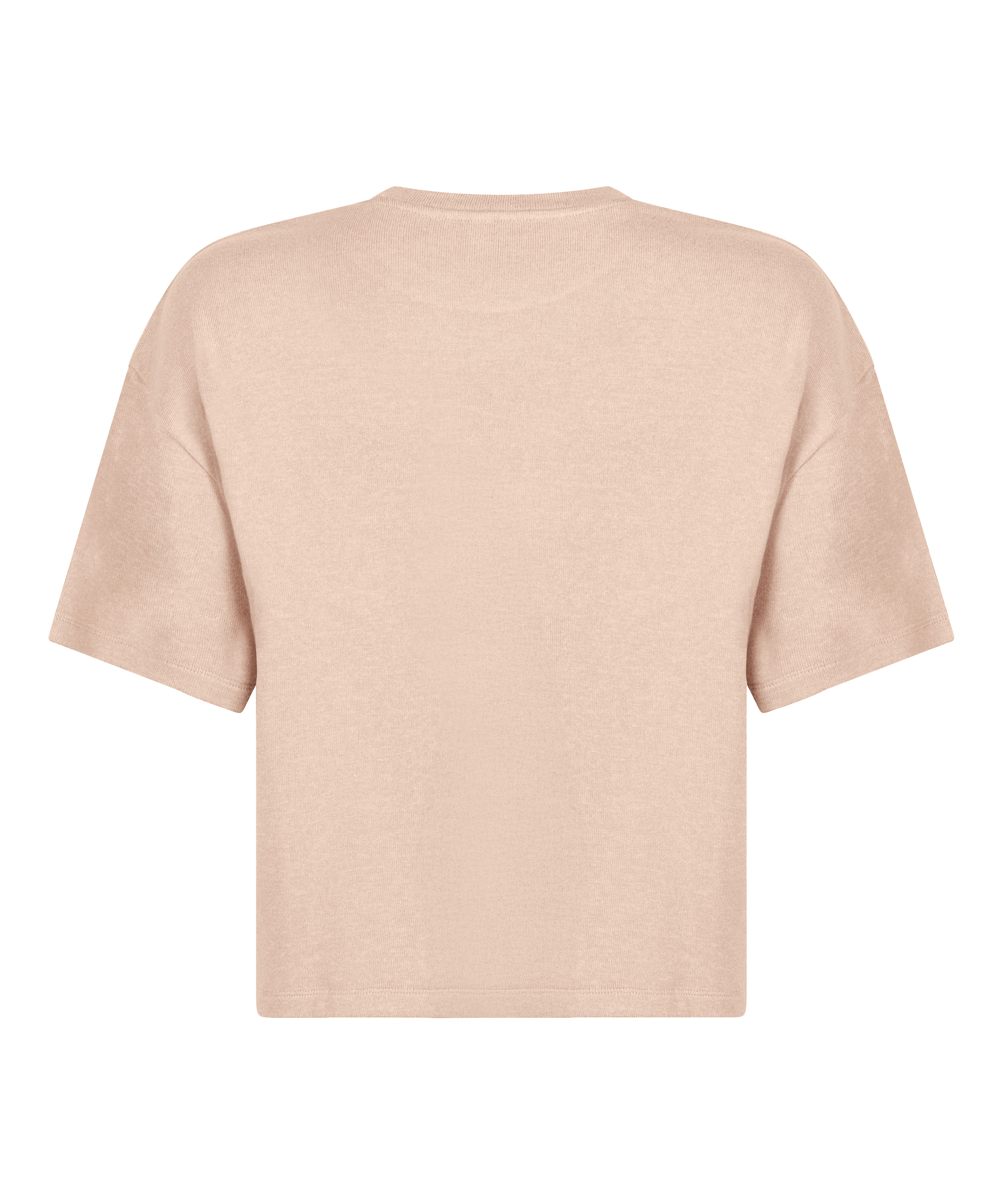 Zanurz się w miękkości w naszym topie od piżamy ze szczotkowanego dżerseju, który daje uczucie delikatnego przytulenia. Luźny, szeroki krój i krótkie rękawy zapewniają idealną równowagę między komfortem i swobodą. Niezależnie od tego, czy czytasz książkę, czy po prostu wykonujesz poranną rutynę, ten top porusza się razem z Tobą. Połącz z dopasowanymi spodniami od piżamy, aby stworzyć komplet.