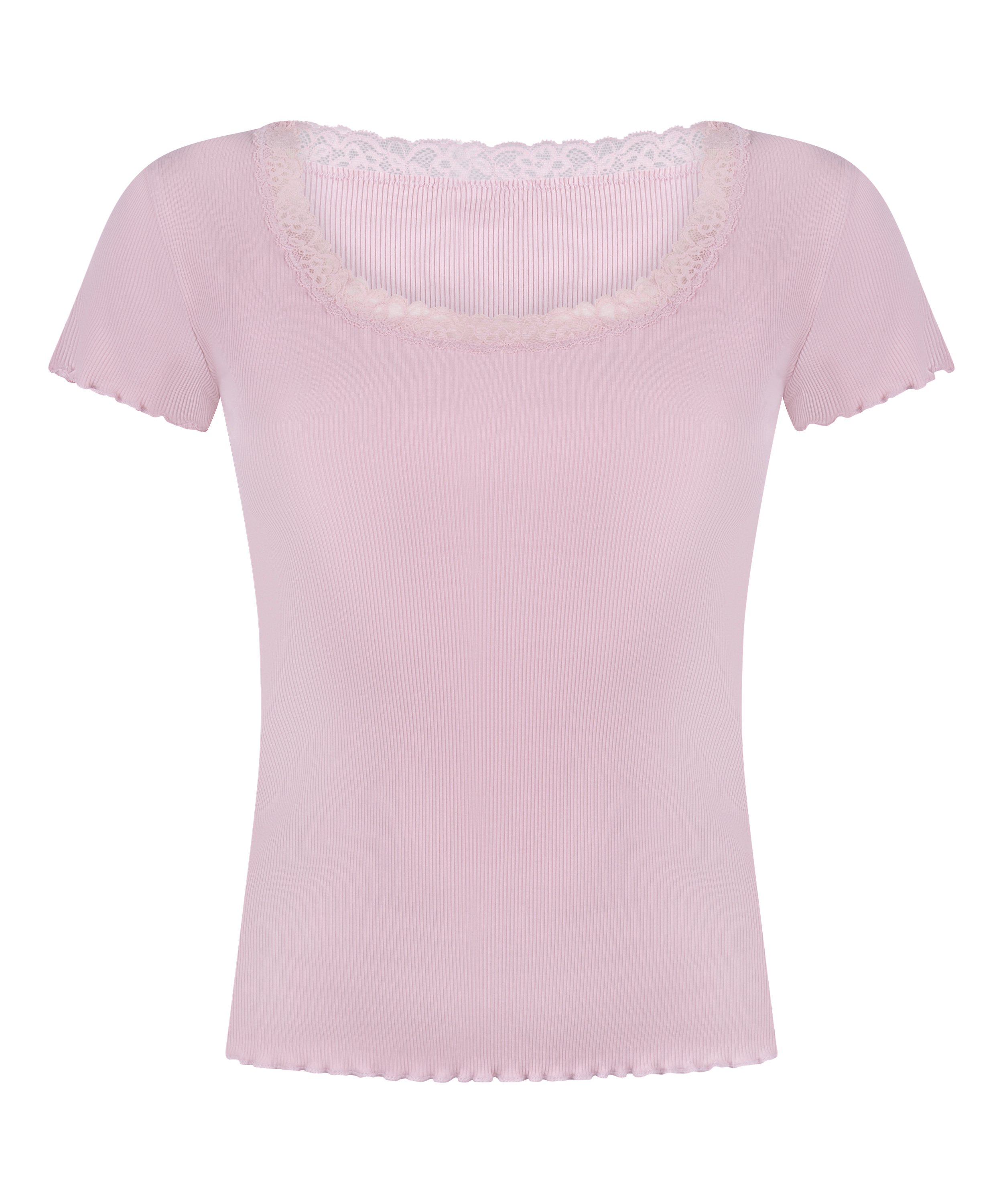 Uroczy i wygodny – ten top z prążkowanego jersey to idealne połączenie casualu i szyku! Wykonany z miękkiej prążkowanej tkaniny z krótkimi rękawami dla codziennego komfortu, wykończony delikatnym koronkowym haftem wzdłuż dekoltu dla tego słodkiego, kobiecego akcentu. Idealny, by podnieść poziom Twoich podstawowych ubrań, zachowując przy tym bezpretensjonalną urodę. Zestawiaj go z dopasowanymi spodniami od piżamy, aby stworzyć kompletny look do relaksu, w którym poczujesz się przepięknie!