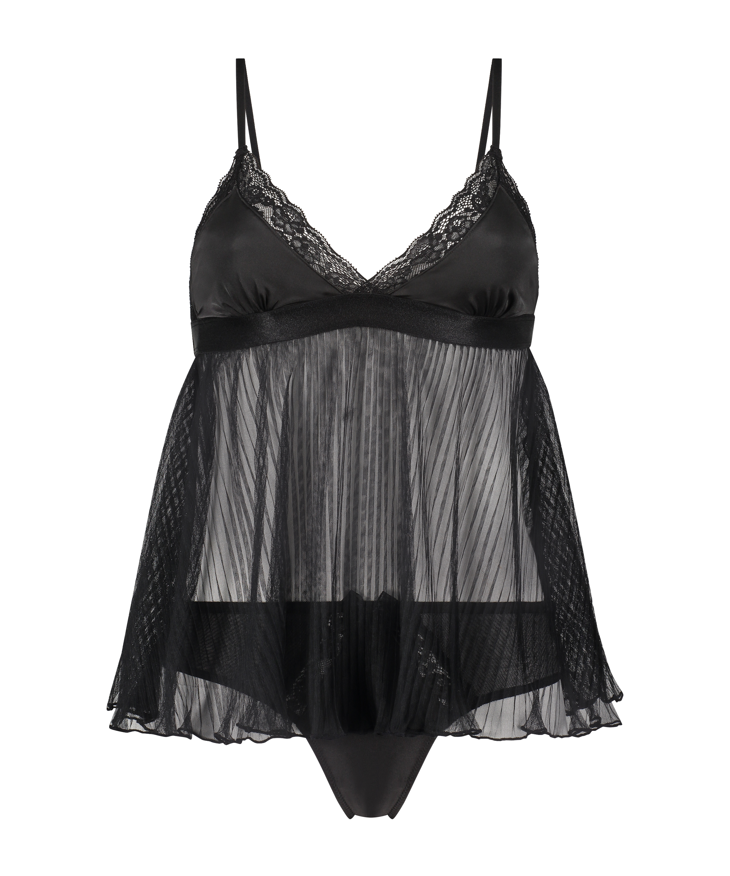 Masz romantyczny nastrój? W takim razie ten zestaw z topem na ramiączkach jest idealny! Miseczki są wykonane z satynowego materiału. Top i majtki mają detale po bokach. Wspaniale!