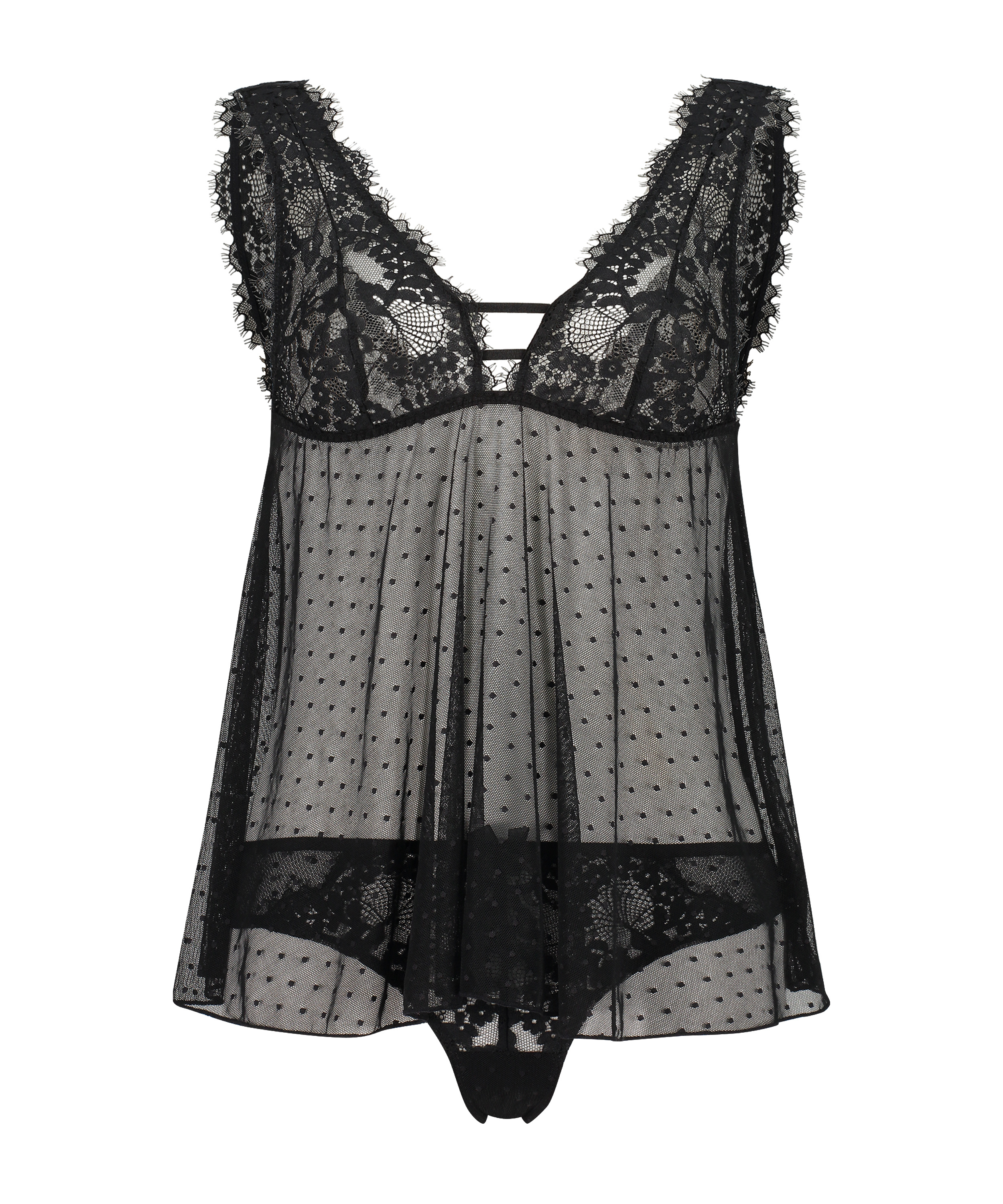 Szukasz zestawu z topem na ramiączkach, który jest elegancki i wygodny? To idealny wybór! Top ma dekolt w serek i koronkowe detale. Majtki są wykonane z siateczki z motywem.